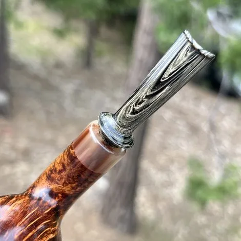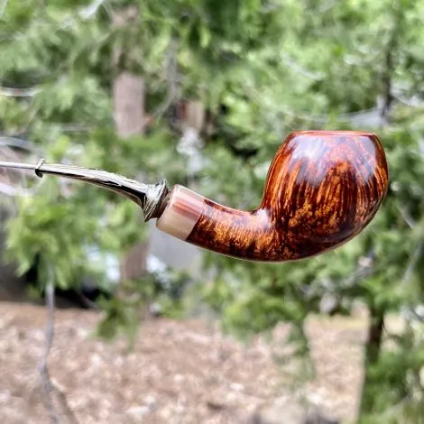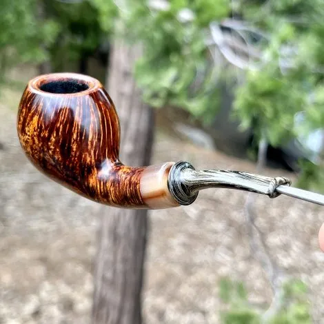 This smooth natural finish Danish egg style tobacco pipe is made from Italian briar, has a ox horn shank accent and is fitted with a handmade German SEM sand and black swirl stem . The stem is fitted with a Delrin tenon for durability. The grain on this pipe is just beautiful and really pops. This will be an outstanding smoking pipe.