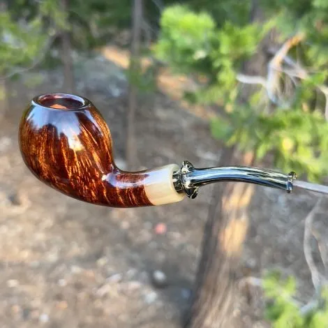 This smooth natural finish Danish egg style tobacco pipe is made from Italian briar, has a ox horn shank accent and is fitted with a handmade German SEM sand and black swirl stem . The stem is fitted with a Delrin tenon for durability. The grain on this pipe is just beautiful and really pops. This will be an outstanding smoking pipe.