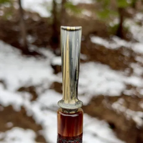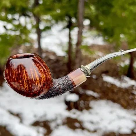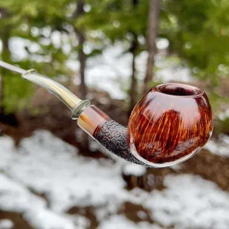 Rare grain! This beautiful Danish egg style tobacco pipe is made from Italian briar, has a ox horn shank accent and is fitted with a handmade stem made from limited edition German ebonite. The stem is fitted with a Delrin tenon for durability. The straight grain on this pipe is rare and really pops. This will be an outstanding smoking pipe.