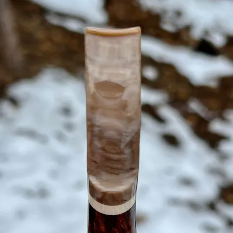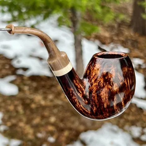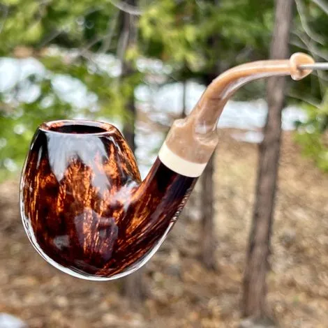 This smooth Danish style full bent tobacco pipe is made from 40 year old Italian briar and is fitted with a handmade stem made from Italian acrylic and features a faux ivory accent. This pipe has a rustic look and feels great in the hand. This pipe will pass a pipe cleaner from bit to the bowl, but you may need to give the pipe cleaner a little twist to make the mortis and airway transition.