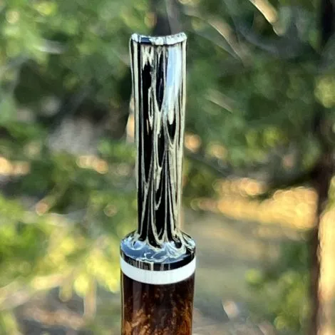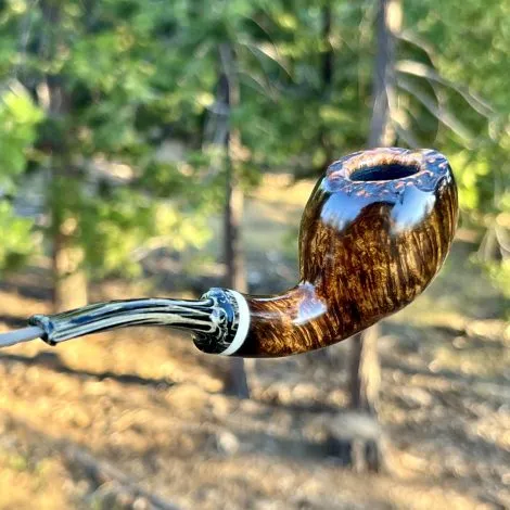 This tobacco pipe features some beautiful grain with a slight darker fade near the end of the shank and the edge of the bowl. The handmade stem features a faux ivory accent and the stem material is German SEM ebonite with a Cumberland swirl.