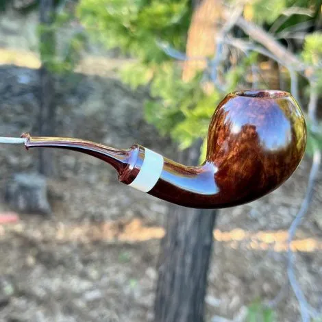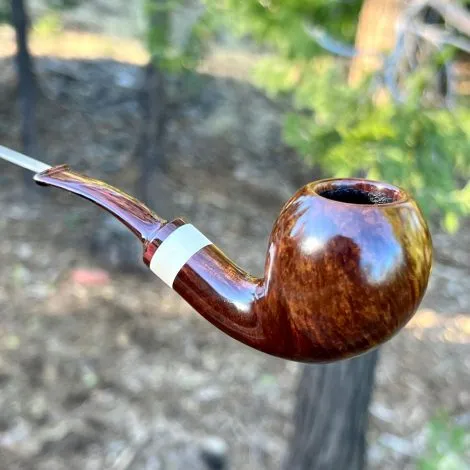 This smooth natural finish Danish egg style tobacco pipe is made from Italian briar, has a faux ivory accent and is fitted with a handmade German Cumberland stem . The stem is fitted with a Delrin tenon for durability. This is a beautiful pipe and will be a great addition to your pipe collection.